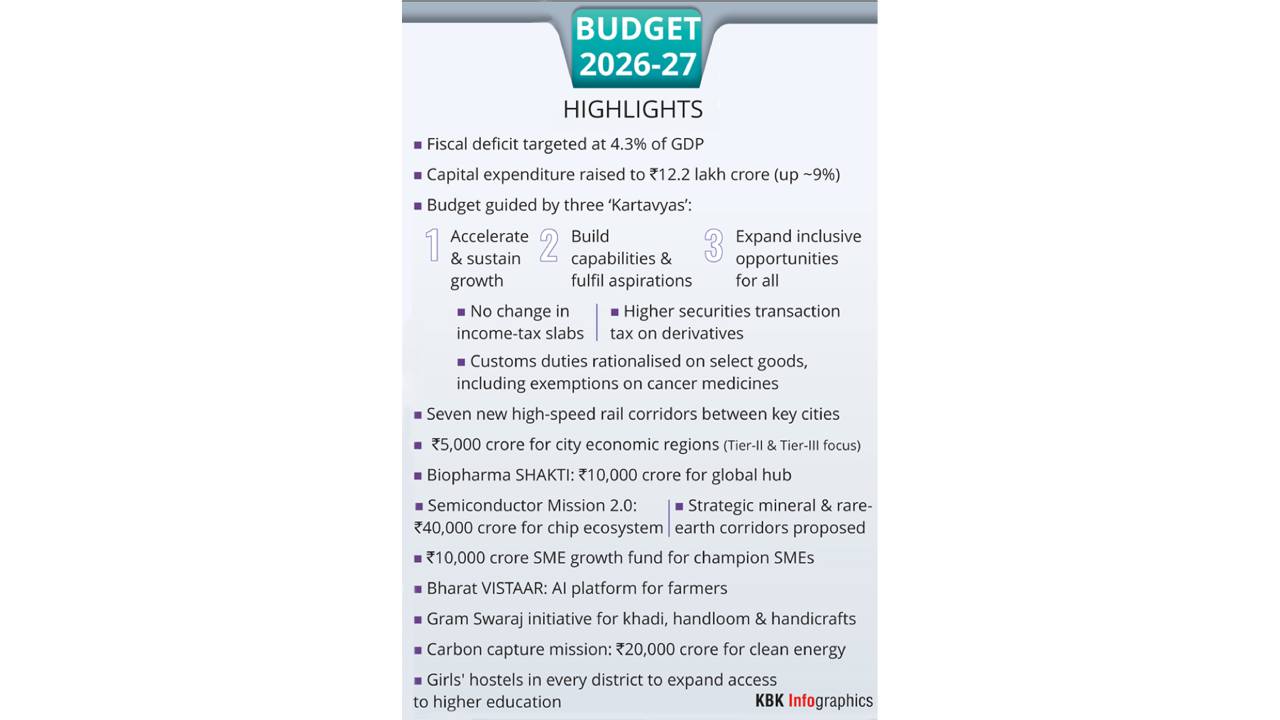 There was an outlay of INR 20,000 crore, in alignment with the Carbon Capture Utilisation and Storage roadmap launched in December 2025, to achieve “higher readiness levels in end-use applications across five industrial sectors.” But the amount would be spent, if it was allocated, over the next five years.Cities, according to the finance minister, were “engines of growth, innovation, and opportunities,” and it was time to change the focus to the smaller cities and towns. Hence, the Budget aimed to map city economic regions (CER), and proposed an allocation of INR 500 crore per CER, or city, “over five years” to implement their plans.