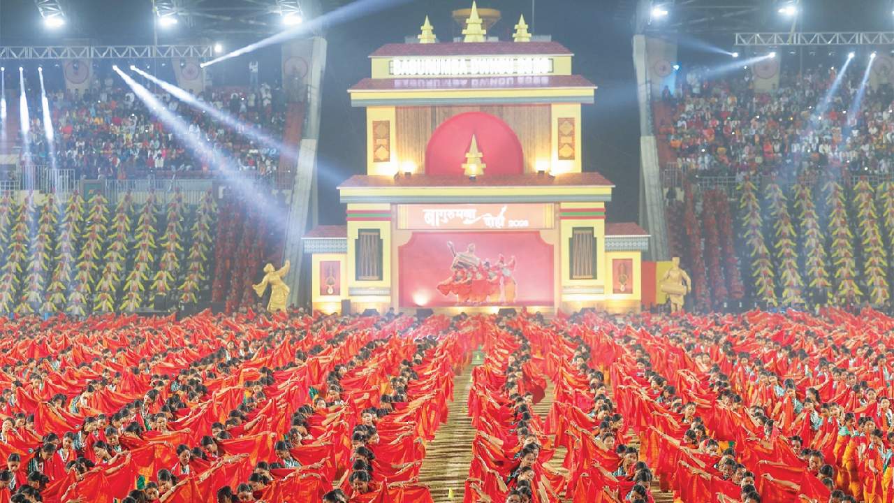 Prime Minister Narendra Modi, who arrived in Assam on a two-day visit, on Sunday witnessed the historic performance of the Bagurumba dance at Arjun Bhogeshwar Baruah Sports complex in Sarusajai, in presence of Governor Lakshman Prasad Acaharya and Chief Minister Himanta Biswa Sarma. Organised by the Assam Government to celebrate the rich cultural heritage of the Bodo community, the event titled ‘Bagurumba Dwhou 2026’, featured the participation of more than 10,000 artistes from 81 assembly constituencies across 23 districts of the State.
