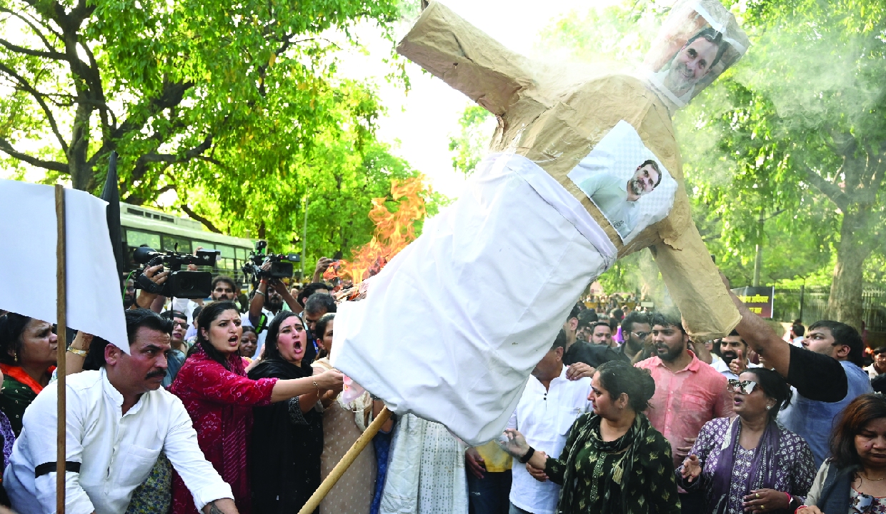 The protestors gathered at Moti Lal Nehru Marg, torched an effigy of Rahul Gandhi and tried to reach his residence when the police used water cannon to disperse them and detained several leaders.