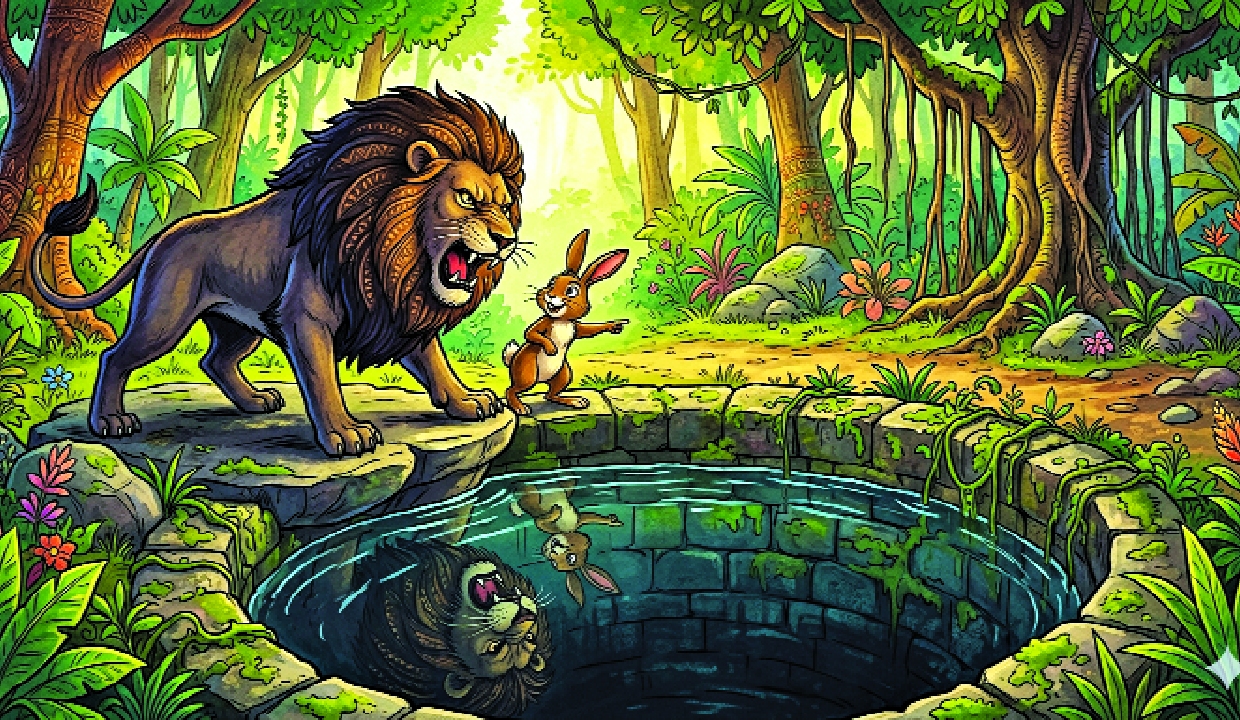 Bhasuraka peered over the edge. Seeing his own reflection in the still water, he mistook it for the rival king. When he roared, the well echoed back an even louder challenge. Blinded by fury, the lion leapt into the deep water to attack. Unable to climb the smooth stone walls, he drowned. The rabbit returned to the other animals, proving that wit is far more powerful than brute strength.