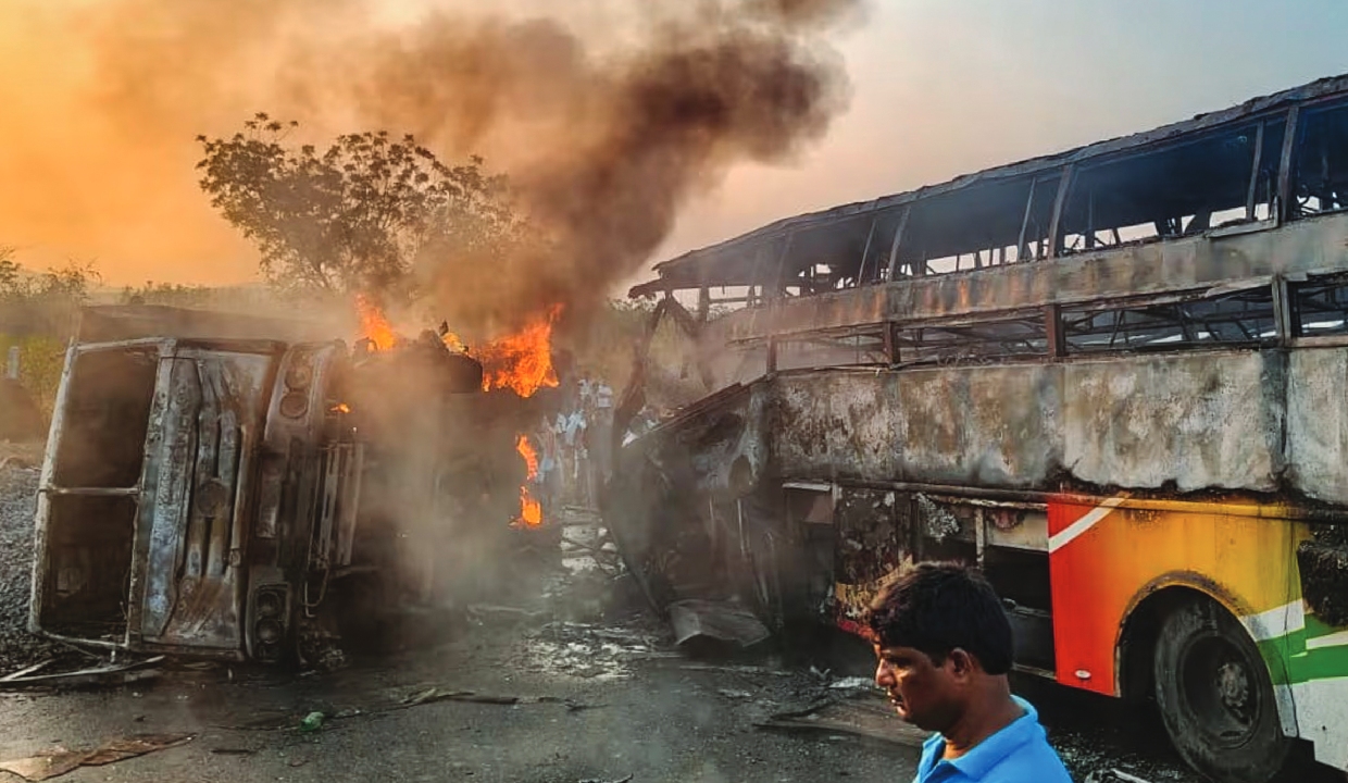 The mishap took place between 5.30 am and 6 am near Rayavaram village on the road leading to Podili when the bus reportedly rammed into the concrete chips-laden dumper truck, colliding with its fuel tank, which sparked a massive inferno.