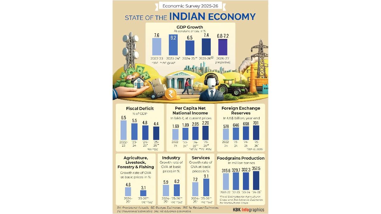 Sounding an overall optimistic note about the Indian economy, which includes a medium-term growth potential that has strengthened to seven per cent, and a “benign” inflation outlook, the Economic Survey (2025-26) highlights key areas of reforms, and inherent weaknesses and challenges that plague crucial areas. The issues that require attention include manufacturing, exports of products, stability of the rupee, and problems in sectors like insurance.