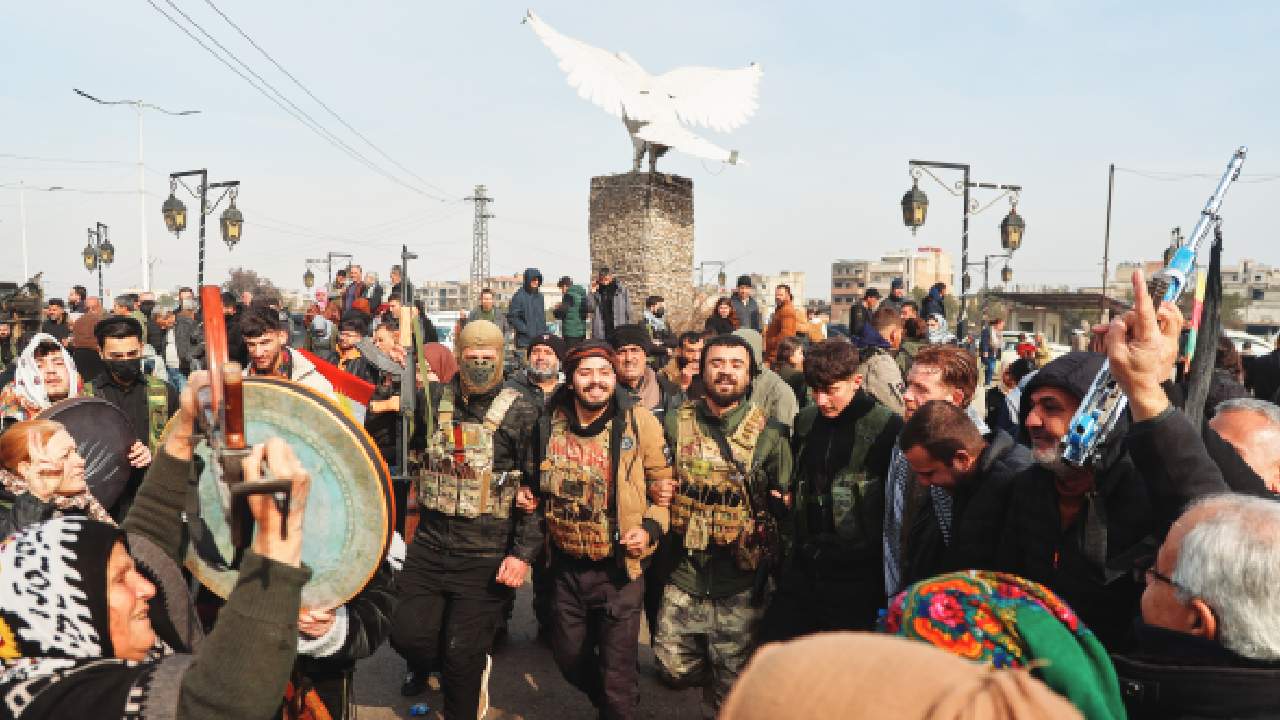 An ambush in December by IS militants killed two US soldiers and one American civilian interpreter in Syria. Kurdish fighters with the Syrian Democratic Forces (SDF) are cheered by local residents ahead of the end of a four-day truce with the Syrian Government in Hassakeh, northeastern Syria.