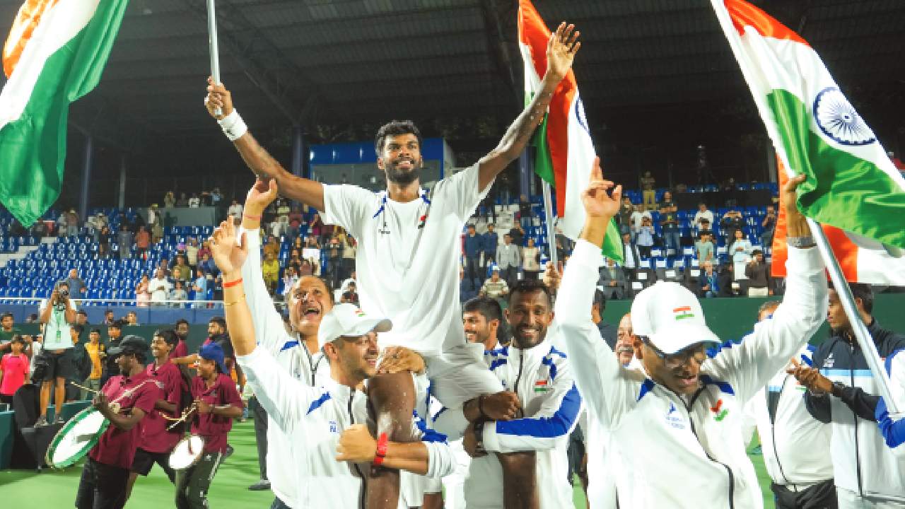 “We’ll start strategising tomorrow, where they play us, on what surface. I stay in constant touch with the players. Team selection and planning is a collective process,” he said. India's Dhakshineswar Suresh being carried by teammates after India won the Davis Cup Qualifier round one against Netherlands at the SM Krishna Tennis Stadium, in Bengaluru, Karnataka.