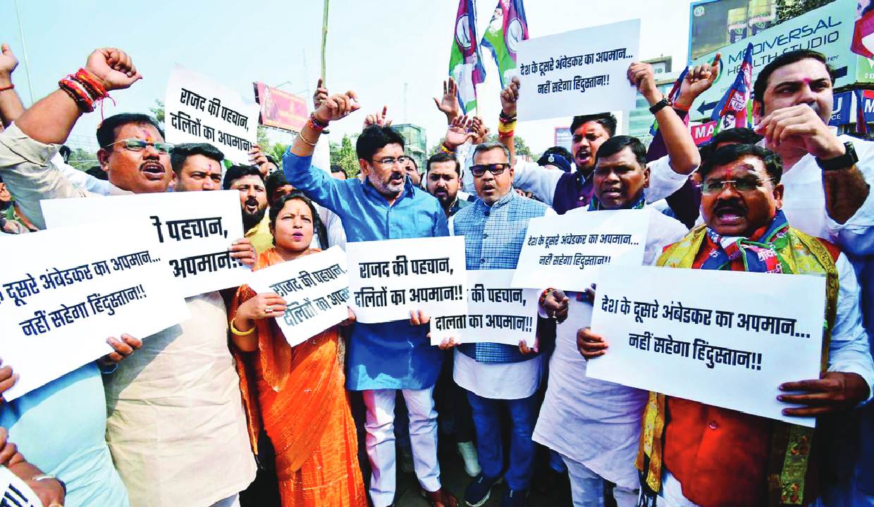 LJP(RV) State president Raju Tiwari and minister Sanjay Kumar Paswan took part in Sunday’s protest. Talking to reporters, Tiwari said, “The use of such a word for our party founder in the assembly demonstrates that Tejashwi Yadav’s thinking is anti-Dalit and anti-social.”