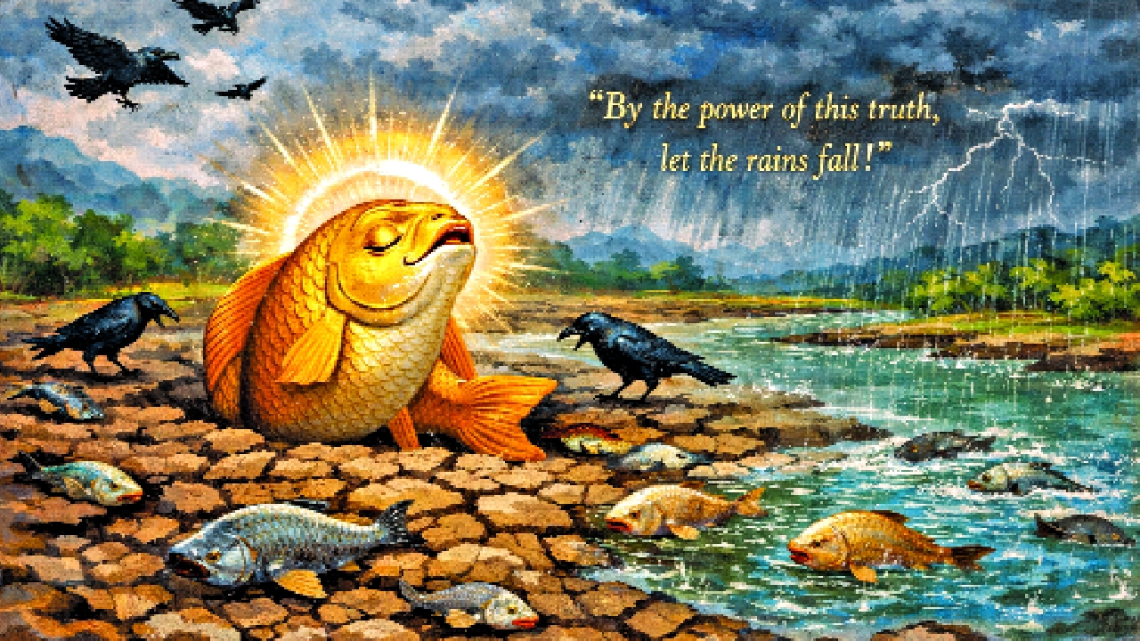 The Jataka tales are a well-known and much loved part of Theravada Buddhist literature that depict earlier incarnations of Gautama Buddha. The Maccha Jataka (the fish Jataka) is one of the most illustrative examples of the Sach-kriya (the act of truth.) In a previous life, the Bodhisattva (the Buddha-to-be) was born as a king of fish in a pond in Kosala. A severe drought occurred. As a result, the pond dried up and the mud cracked. The fish started dying. Taking advantage of the opportunity, crows began circling to pick up the gasping fish. Seeing this, the Bodhisattva rose to the surface to salvage the situation. He did not plead with the gods, instead he relied on his virtue. He made a declaration to the entire universe, “In my entire life, I have never intentionally harmed a single living being. By the power of this truth, let the rains fall.” Legend has it that the sky immediately darkened, and a torrential downpour saved the pond and all its inhabitants.