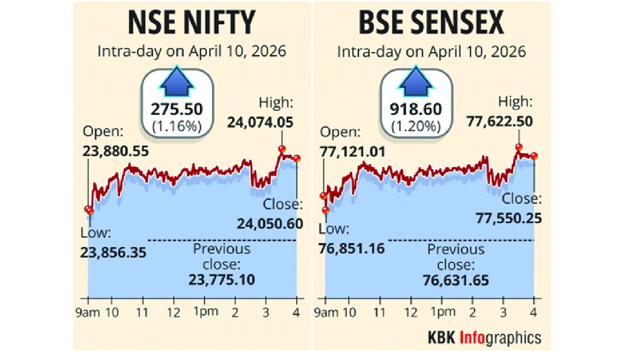 After staying in the positive territory throughout the day, the 30-share BSE Sensex later jumped 918.60 points or 1.20 per cent to settle at 77,550.25. During the day, it surged 990.85 points or 1.29 per cent to 77,622.50. The 50-share NSE Nifty climbed 275.50 points or 1.16 per cent to end at 24,050.60.