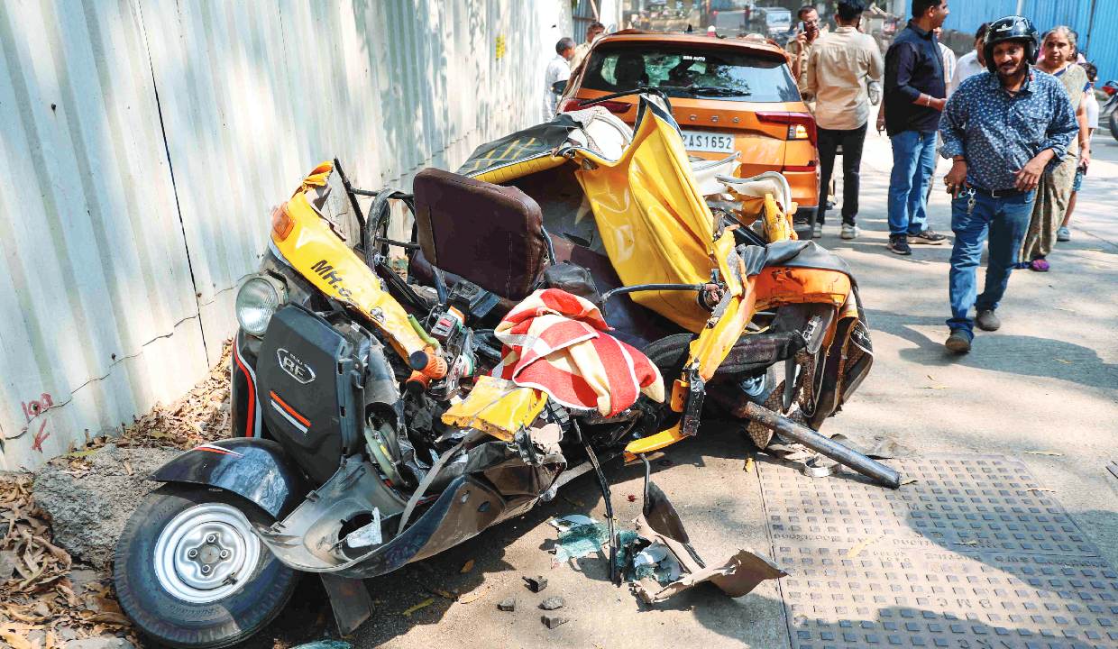 The incident took place near the Johnson and Johnson factory on LBS Road at 12.15 pm. The parapet segment fell on a passing autorickshaw and a Skoda car, nearly crushing both the vehicles.