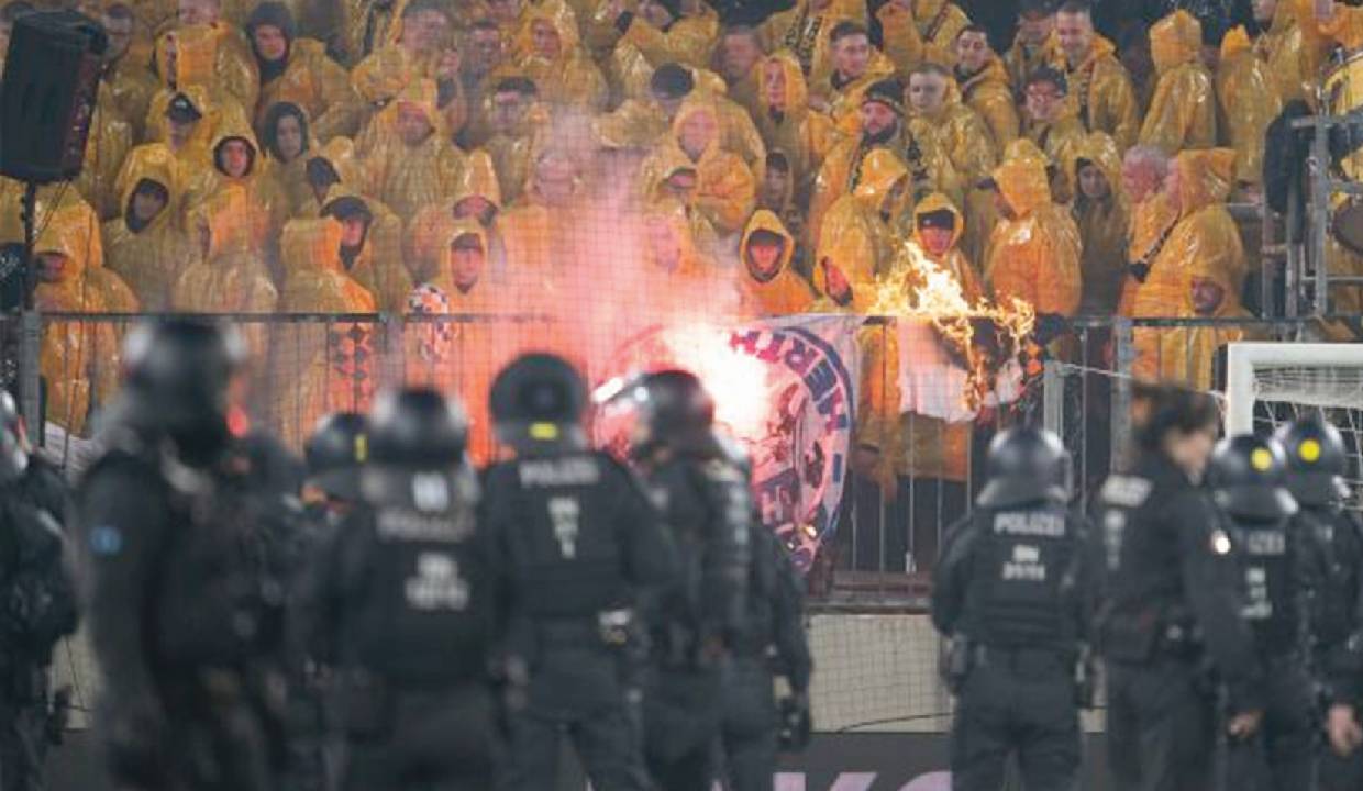 Dresden fans in the club’s yellow and black colors ran the length of the field toward a section containing fans of visiting team Hertha, who also jumped a fence and moved toward the field. Lit flares were thrown from both sides, some of them landing near spectators, and some fans seemed to trade blows.