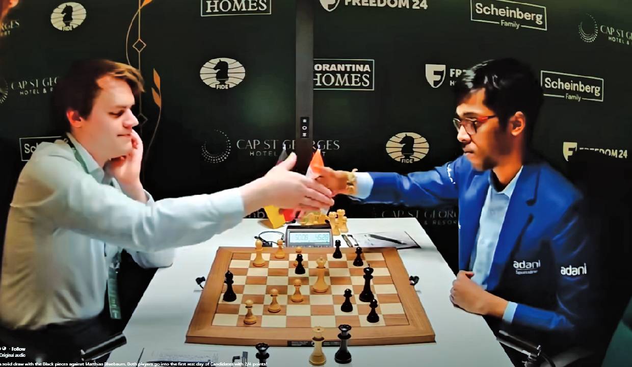 Grandmaster R Praggnanandhaa played out a draw with German Matthias BLuebaum while Uzbekistan’s Javokhir Sindarov grabbed sole lead after defeating pre-event favourite Fabiano Caruana of the USA in the fourth round of the Candidates chess tournament.