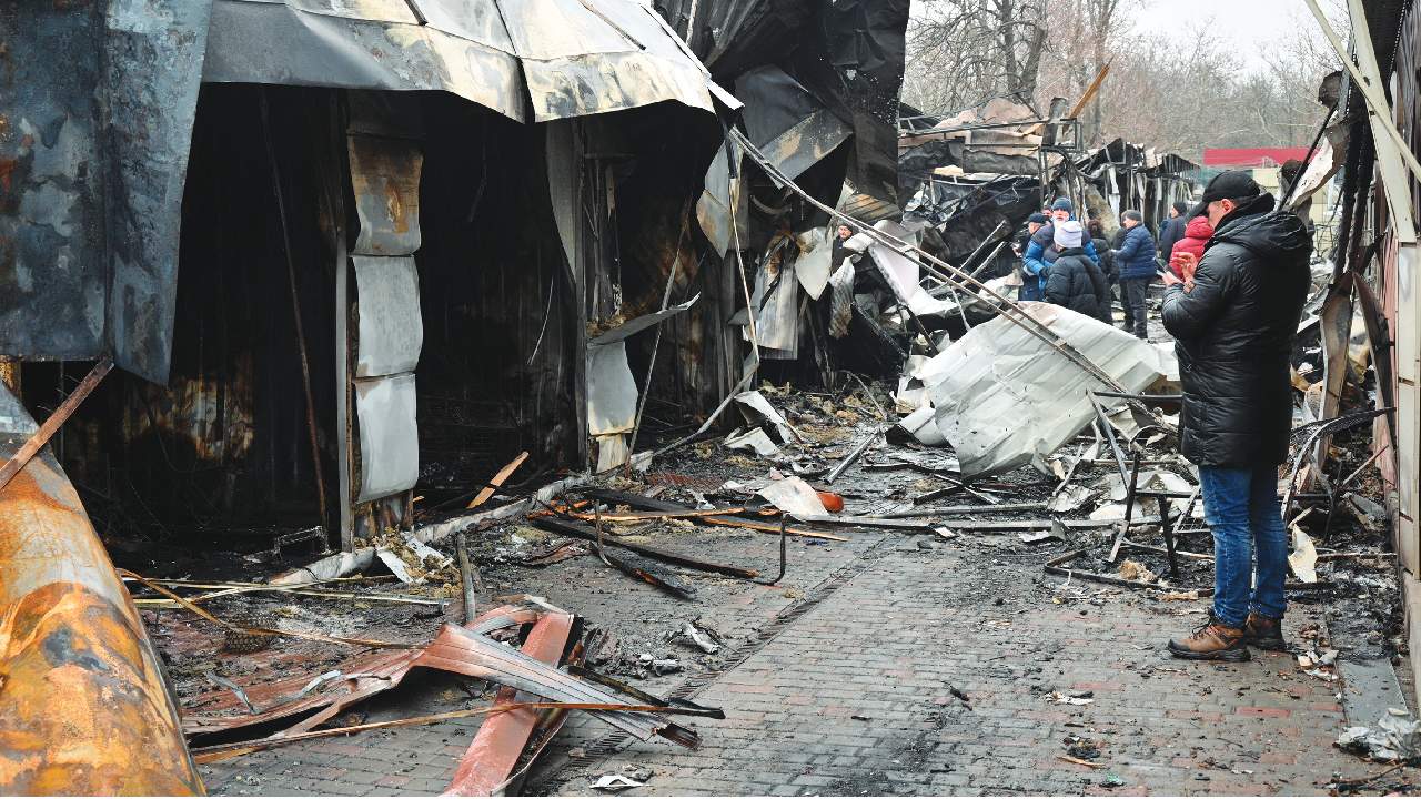 Temperatures have moved above freezing point in Kyiv, but it is still bitterly cold in the city. Mayor Vitalii Klitschko said that almost 2,600 residential buildings were left without heating as the attack damaged critical infrastructure. In Odesa, one person was injured as a residential high-rise was partially destroyed and a market and a supermarket caught fire, regional head Oleksandr Hanzha wrote on Telegram. People looking at a ruined city market following a Russia's attack in Odesa, Ukraine.