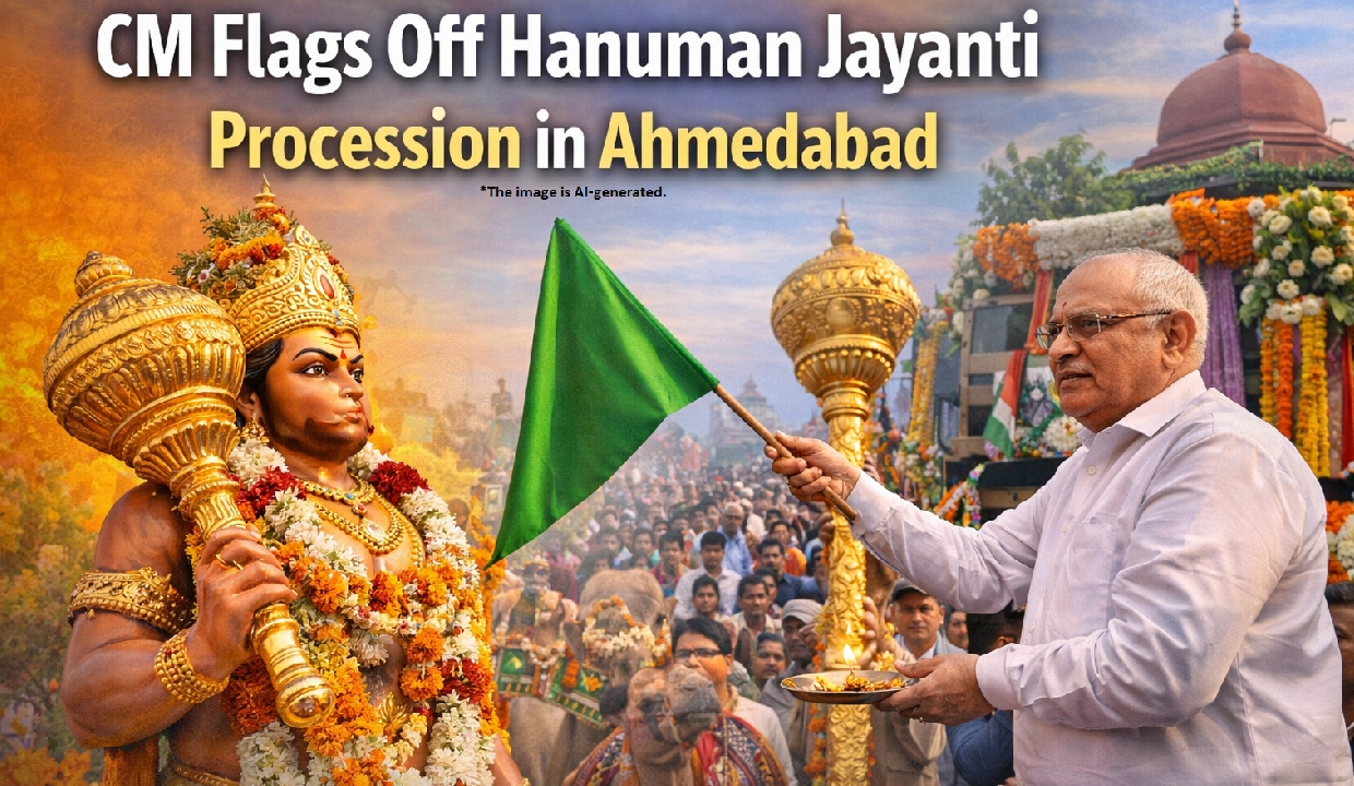 On the occasion of Hanuman Jayanti, Gujarat Chief Minister Bhupendra Patel flagged off a grand procession from the renowned Camp Hanuman Temple in Shahibaug, Ahmedabad. The celebrations began with a collective recitation of the Hanuman Chalisa in the morning. The Chief Minister performed rituals, offered prayers, and inaugurated the procession by ceremonially launching the main chariot after performing aarti and offering a coconut. The procession featured decorated elephants, camel carts, large symbolic maces, trucks, and a special tableau themed on “Operation Sindoor,” which attracted significant attention.