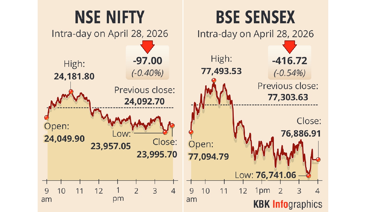 The 30-share BSE Sensex declined 416.72 points, or 0.54 per cent, to settle at 76,886.91. During the day, it lost 562.57 points, or 0.72 per cent, to 76,741.06.