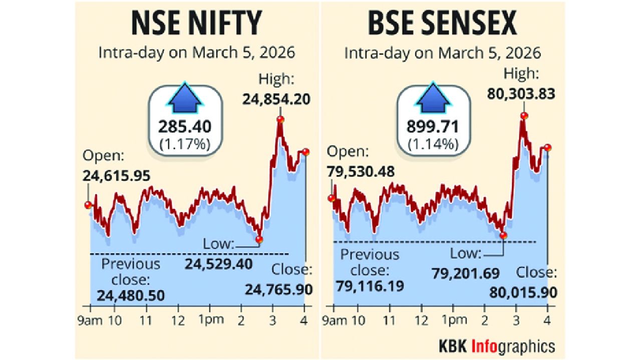 Benchmark stock indices Sensex and Nifty bounced back on Thursday, closing higher by more than 1 per cent in line with a rebound in global equities after recent sharp losses due to the conflict in West Asia.Snapping its four-day decline, the 30-share BSE Sensex rebounded 899.71 points or 1.14 per cent to settle at 80,015.90. During the day, it surged 1,187.64 points or 1.50 per cent to 80,303.83. The 50-share NSE Nifty climbed 285.40 points or 1.17 per cent to end at 24,765.90, ending its three-day falling streak.