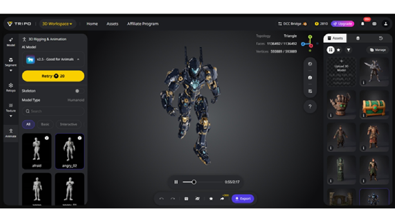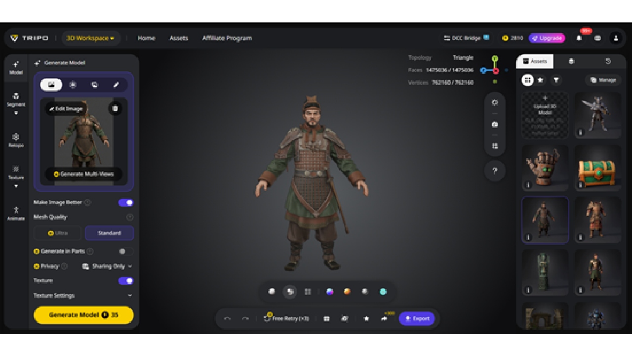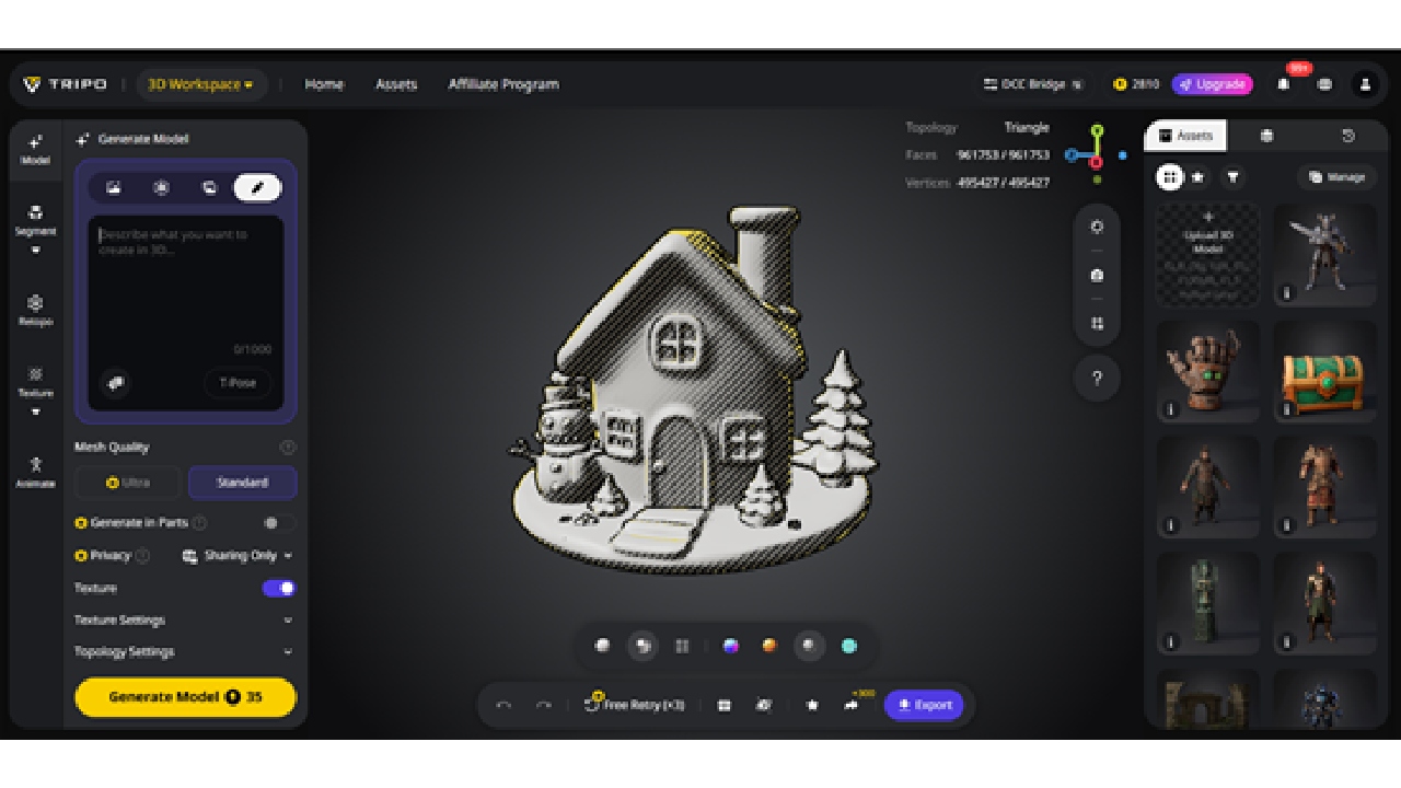 Tripo Studio redefines 3D creation as a unified, AI-driven workflow. From image to 3D and text to 3D, through segmentation, retopology, texturing, and auto-rigging, the platform supports the full lifecycle of 3D asset creation. Creators—from hobbyists to large studios—can move from concept to production-ready models efficiently, while maintaining artistic control.