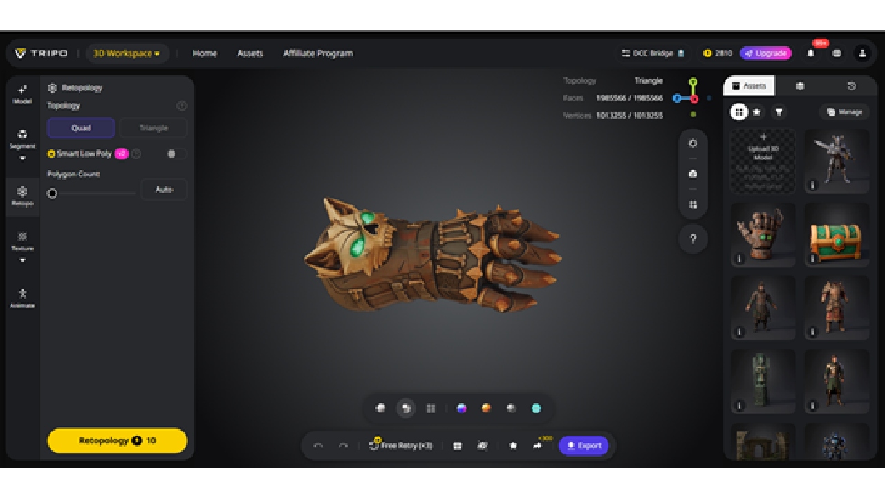 The Retopology tool generates clean, optimized meshes from existing models. Quad and triangle topology options balance editing flexibility, animation compatibility, and surface fidelity. Smart Low Poly modes simplify geometry while maintaining structure, ensuring models are suitable for real-time rendering or VR/AR applications.