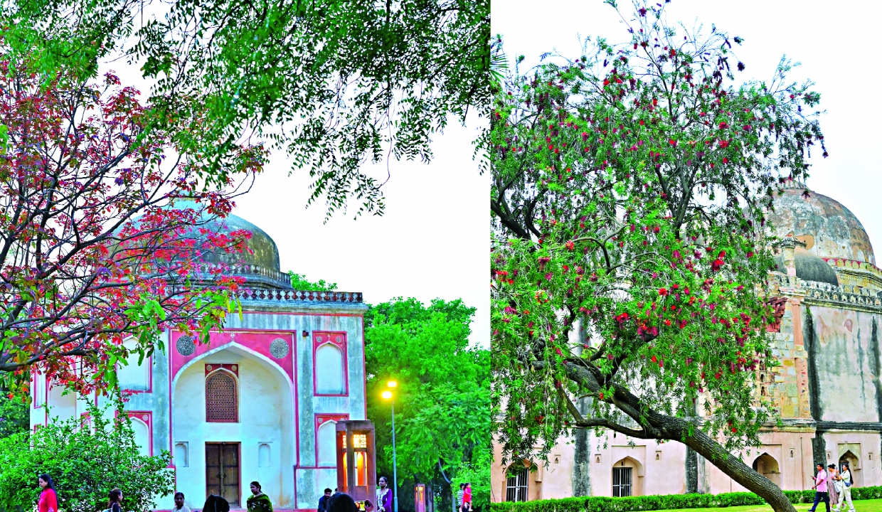 Just down the road, Lodhi Garden has a totally different energy. It is basically the city’s social hub right now, with the lawns completely packed with people trying to enjoy the perfect weather before the brutal summer heat ruins it. Even with the crowds, the trees deserve to be the main event, especially the massive Semal or silk cotton tree that drops heavy red flowers hitting the grass with a soft thud. Standing quietly under the canopy allows a moment to actually notice the rough bark and follow the fallen flowers back to the Bara Gumbad or Sikandar Lodi’s tomb, and one might even hear the dry pods of the Indian elm rattling in the breeze while groups of friends in bright spring outfits blend seamlessly into the greenery.